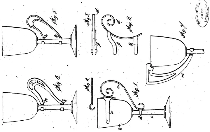 In 1913, Georgina Heddon invented a holder for stemmed glasses, using clips to secure the bowl and stem. Her design prevented spills and made glasses easier to hold, while its shape and material could be adapted for practical use and decorative effect.