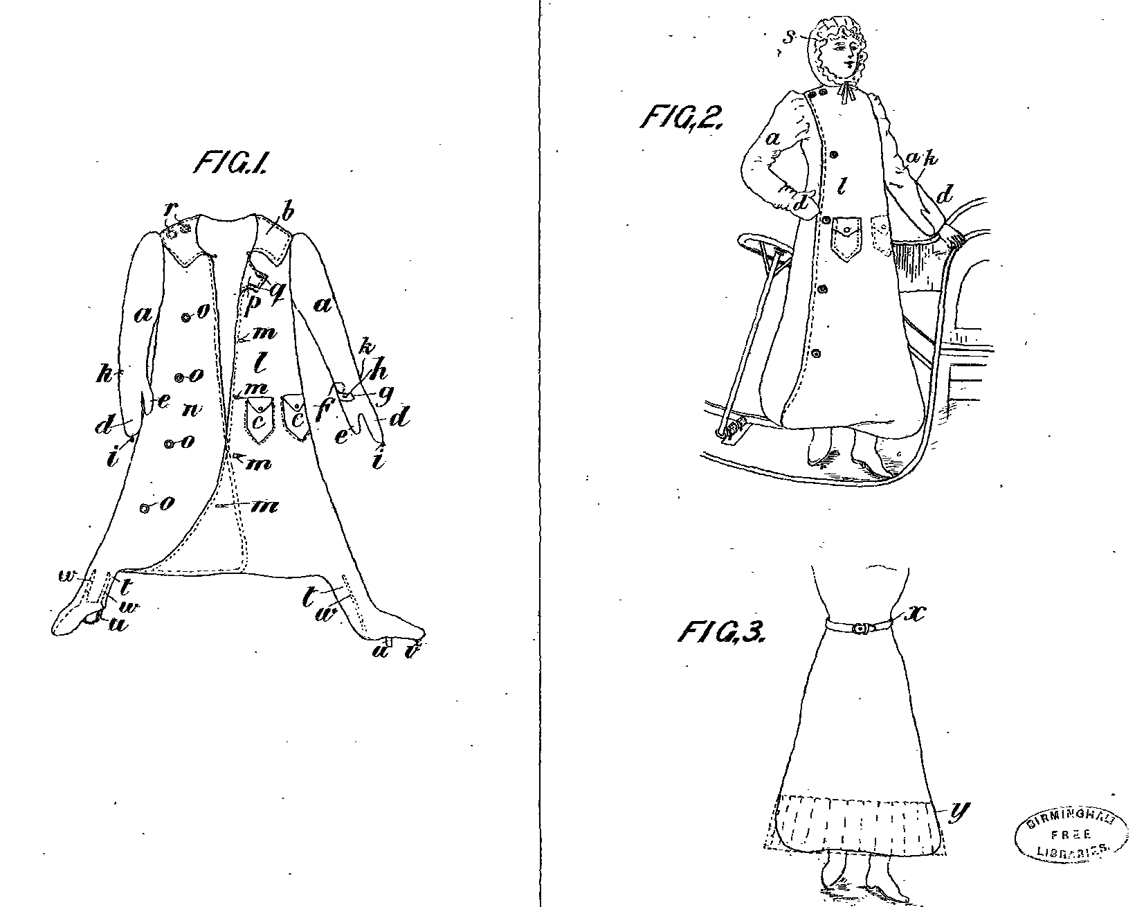 On December 13, 1906, Gertrude Goad, a married woman of London, obtained a patent for a protective ladies’ motoring garment designed to shield travelers from cold, wet weather, and dust. Her design combined a double-breasted coat, mitten-style sleeves, a hood, and a sack-like lower section with built-in gaiters to keep the wearer warm, covered, and free to move.