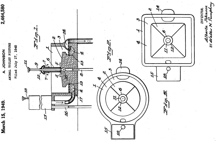 On March 15, 1949, Alberta Johnson of Old Westbury, New York, was granted a patent for an innovative animal toiletry facility. Her design featured a stationary fixture that allowed animals to mount a platform where their excreta could be flushed away, thereby improving the sanitary conditions of public lawns and parks.