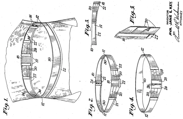 On July 11, 1944, Ava Jane E. Key of Hempstead, New York, obtained a patent for a novel garment waistband. Featuring firm front panels and wide, fan-shaped elastic sections at the back, her design kept garments securely fitted while allowing free movement.