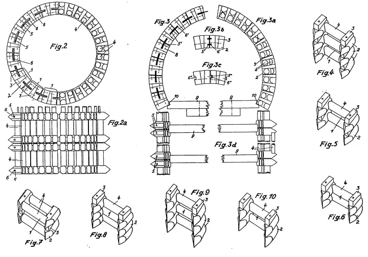 On April 10, 1935, Beate Baron of Beuthen, Upper Silesia, received a patent for a ring- or arch-shaped mine support built from layered round timbers. The flexible structure could absorb heavy rock pressure without collapsing, making it well suited for tunnels, shafts, and related underground works.
