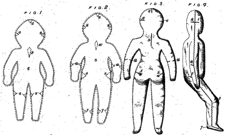 On December 18, 1928, Charity Smith of Ithaca, New York, patented an improved “rag doll” design. Her method used specially shaped, pre-printed fabric patterns with dart seams to create natural curves at the elbows, knees, and neck — producing lifelike, easily made stuffed figures without the bulky gathers of earlier dolls.