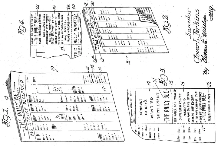 On November 28, 1922, Clover Lewell Perkins of Highland Park, Illinois, patented an innovative newspaper design that reduced printing costs for classified advertisements. Her system separated classified ads into a smaller supplement distributed only to readers who requested it, using matching coupons to link the main paper and the supplement for accurate distribution and accounting.