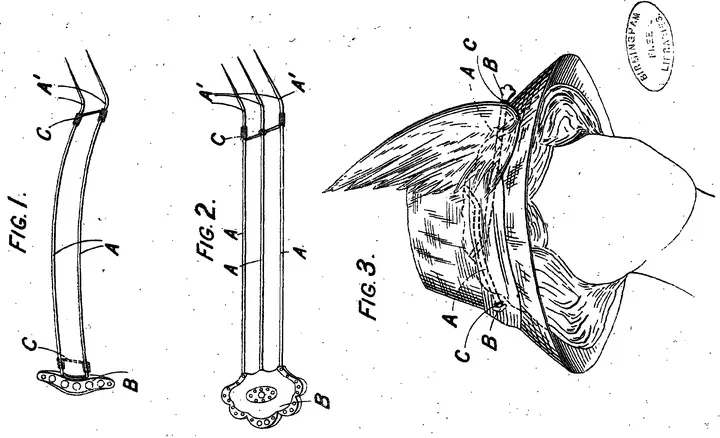 On November 18, 1909, Anna, Countess von Holnstein aus Bayern, of Bavaria and temporarily residing at the Ritz Hotel in London, patented an improved hat pin. Her design featured two or more prongs with upward-bent points and a sliding distance piece that could move along the pin’s length, allowing secure attachment without protruding outside the hat.
