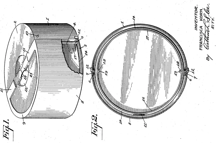 On February 11, 1925, Francesca Korn of San Francisco, California, received a patent for an improved cake box designed to protect cakes during storage and transport. Its container, sliding cover, and removable tray made it easy to insert or remove a cake without damaging its sides while keeping it fresh.