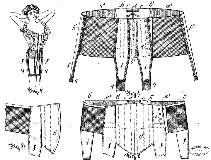 On March 2, 1905, Jane Phillips Hodgkinson of Manchester patented a contoured abdominal belt designed to be worn beneath the corset. Made from alternating elastic gussets and stiffened textile sections, her belt was anchored by stocking-attached straps to prevent it from riding up — offering improved figure-shaping, greater comfort, and durability.