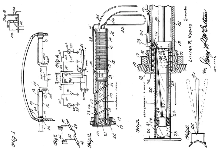 On September 12, 1950, Lillian R. Kubias patented a turn-signaling device with illuminated transparent arms that extended from a vehicle to indicate direction. The system used solenoids and timed circuits to automatically deploy, flash, and retract the signal arms.