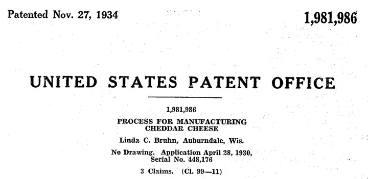 On November 27, 1934, Linda C. Bruhn of Auburndale, Wisconsin, patented a method for producing small cheddar cheese loaves that resist molding and rind formation without sterilization. Her process sealed each loaf with a heat-formed butterfat coating and foil layer, preserving the cheese’s natural aging qualities while ensuring stability during storage and transport.