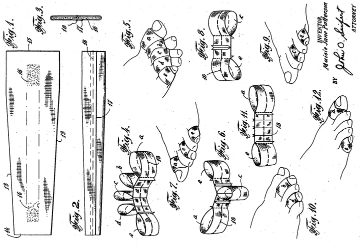 On August 1, 1944, Maisie Jane Patterson of Chapel Hill, North Carolina, was granted a patent for a novel toe-protecting device. It featured soft fabric loops and padding to shield the toes from friction, corns, and calluses while keeping them comfortable inside shoes.