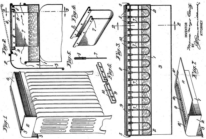 On June 17, 1930, Maude Mayo Bentz of Montclair, New Jersey, obtained a patent for a combined humidifier and air-deflector designed for use on steam or hot-water radiators. Her device used a water trough, hinged cover, and vertically arranged wick elements to moisten and redirect rising warm air, improving indoor comfort while reducing wall and woodwork soiling.
