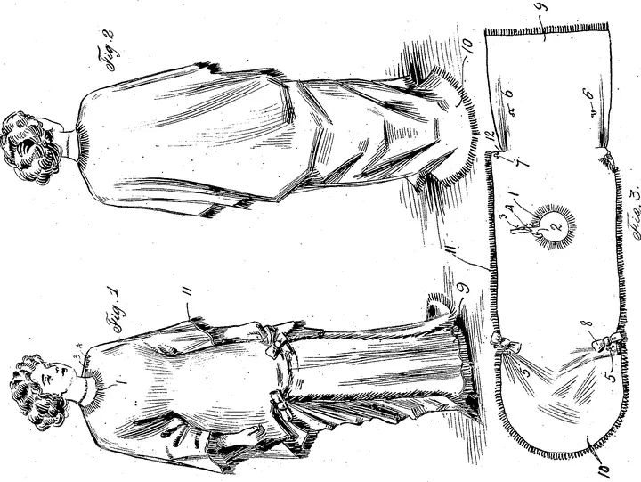 On July 21, 1914, Nelle M. Peters of Chicago, Illinois, patented a one-piece, sleeveless garment designed to drape gracefully over the shoulders, giving the illusion of sleeves. Made from a single piece of fabric, it featured cleverly placed hooks and eyes to fasten the front and back, combining elegance with practical simplicity.