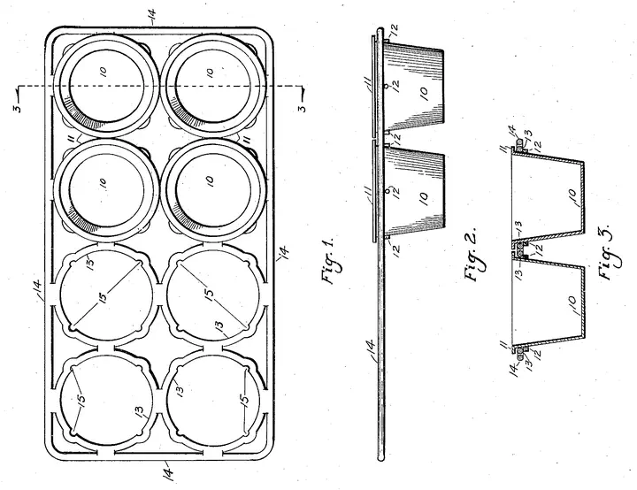 On March 1, 1949, Opal M. Gross of Denver, Colorado, received a patent for a modular cooking vessel made from rigid rings joined in a flat frame. Frusto-conical cups locked into the rings by means of exterior lugs, allowing cooks to combine any number of identical cups into a single, stable unit.