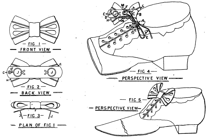 On October 30, 1905, Francesca Myers of St. Kilda, Australia, patented an ornamental attachment for boots and shoes designed to cover and secure the knot and loose ends of laces. By fastening a bow, rosette, buckle, or similar decoration over the lacing, her device kept the ties from coming undone and added a decorative finish.