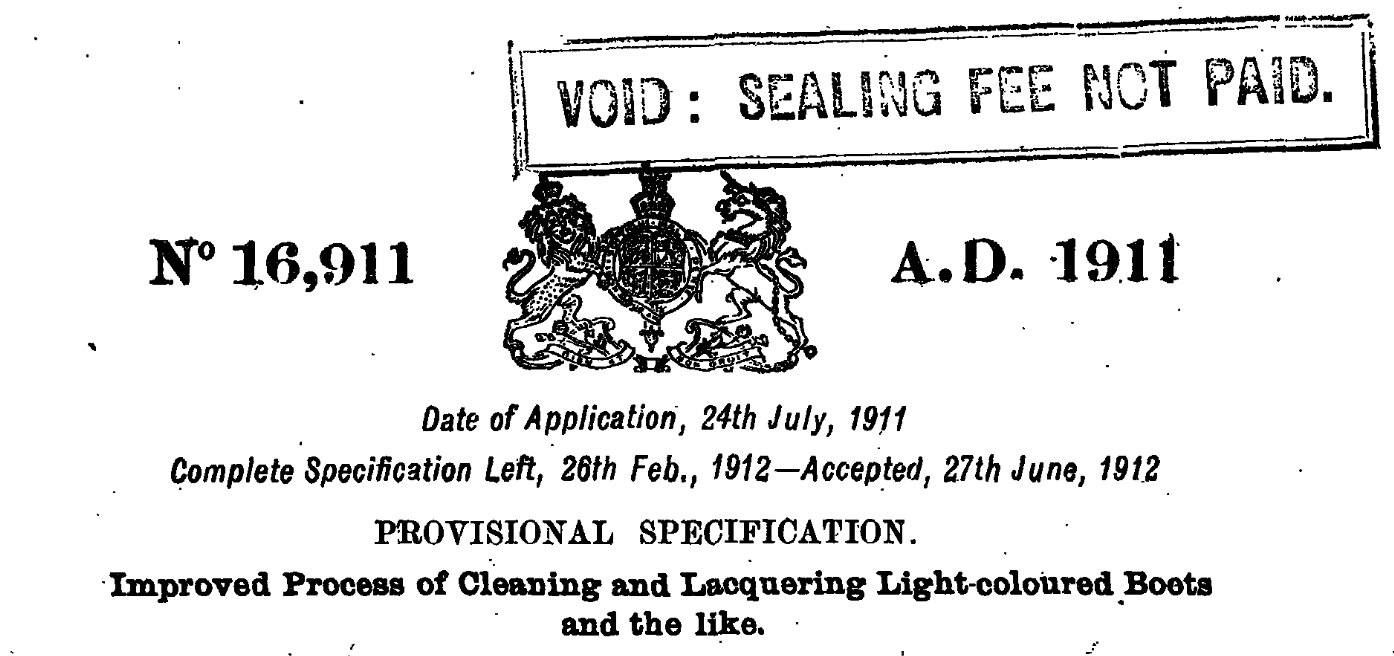 On June 27, 1912, Mrs Oline Haagensen of Aarhus, Denmark, patented an improved process for cleaning and refinishing light-coloured boots. By carefully removing old polish and applying layered colouring and wax finishes, worn footwear could be restored to a glossy appearance resistant to water and polish.