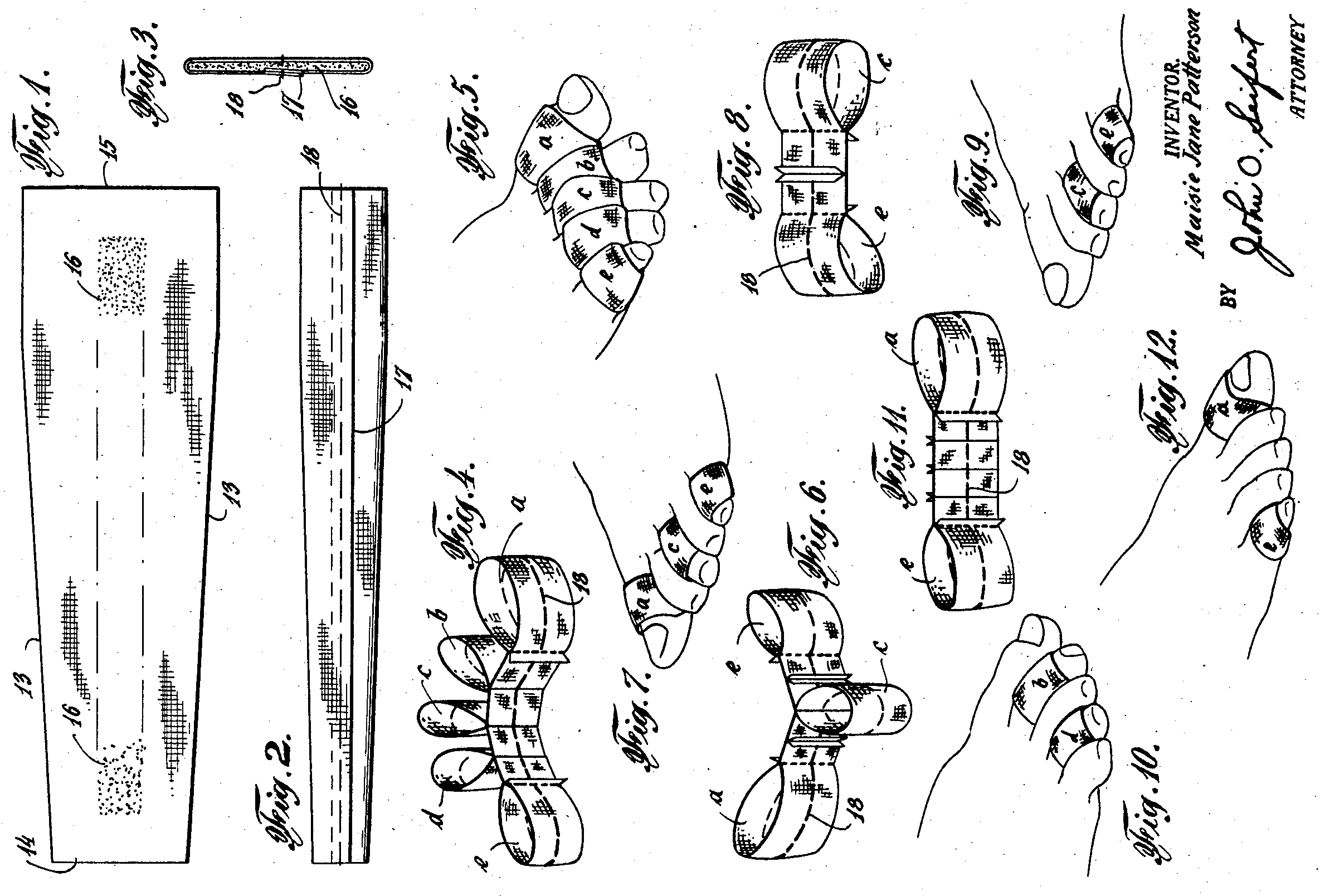 On August 1, 1944, Maisie Jane Patterson of Chapel Hill, North Carolina, was granted a patent for a novel toe-protecting device. It featured soft fabric loops and padding to shield the toes from friction, corns, and calluses while keeping them comfortable inside shoes.